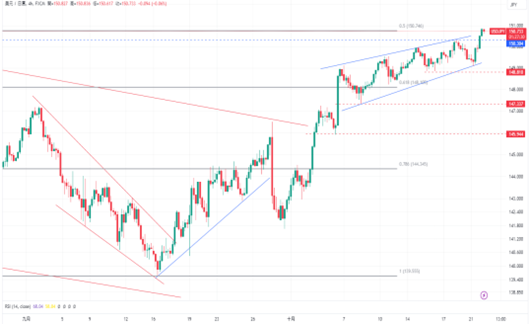 美元/日元自149大幅上升,RSI指数也表明势头重新转向看涨。上涨方面,下一个阻力位于150.75水平。下跌方面,初步支撑位于148.81日圆,若没守住可能会在盘面上形成上升楔形的反转型态。